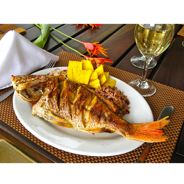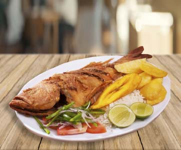 Pescado condimentado con el secreto de la casa, porción de patacones, deliciosa...